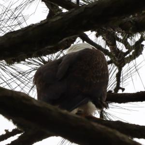 | Note: | Joanne V reports: when I arrived I saw Ricky on a branch in the nesting tree eating a fish. I kept hearing chirps coming from inside the nest, but couldn’t see a head. After a while, a head popped up and I saw Lucy in the nest (see photo). It’s gets a bit confusing at this point because I initially assumed incubation was taking place, especially since I witnessed mating 8 days prior. But then I walked around to try to get different angles for photos, and I missed Lucy leaving the nest, fly into onto a nearby branch. Then I could not locate Ricky. So at this point, I don’t think incubation is occurring unless Ricky went into the nest to sit on the eggs while Lucy was on the branch. I just didn’t observe them trading places. | ||||||