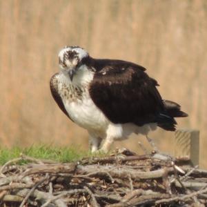Ozzie and Harriet we believe return each year to our platform here on Crab Alley Creek. For 2024, a female juvenile appear on March 9th, possible their only offspring from 2023. Mar 15, and osprey appeared and on the 17th a male and female were around, yet not on the nest. Friday, Mar 22, the mail and female were on the nest mating and spending much of the day together. Only one osprey for several days was nearby and bringing sticks to the nest until Mar 30 an osprey appeared high in the sky, came to the nest, and the two have pretty much been together since with mating and working on the nest.